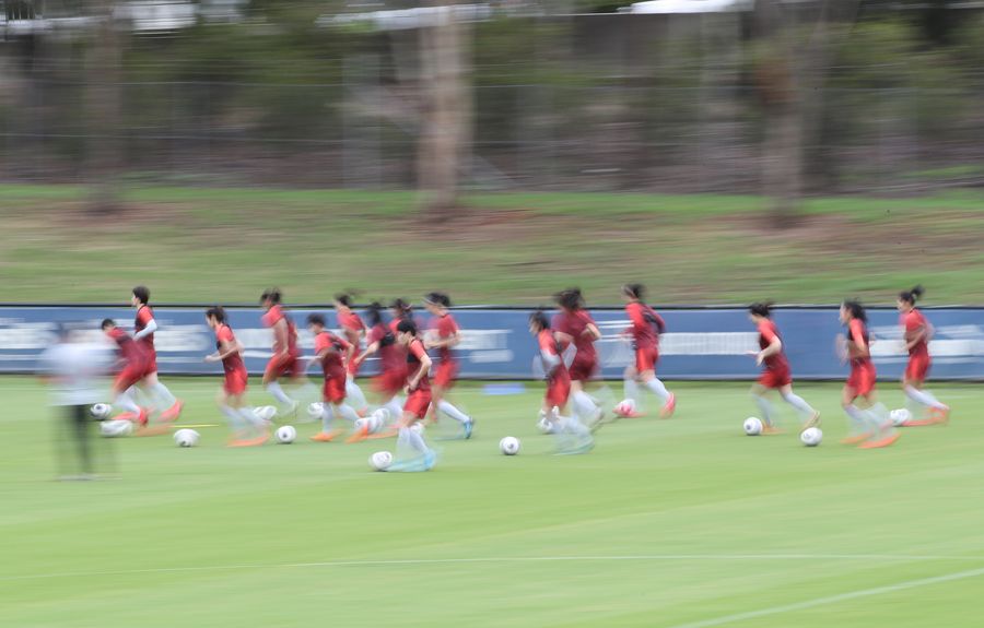 Players of Team China attend a training session for the upcoming Olympic women's football qualifying Group B matches in Sydney, Australia, Feb. 6, 2020. (Xinhua/Bai Xuefei)