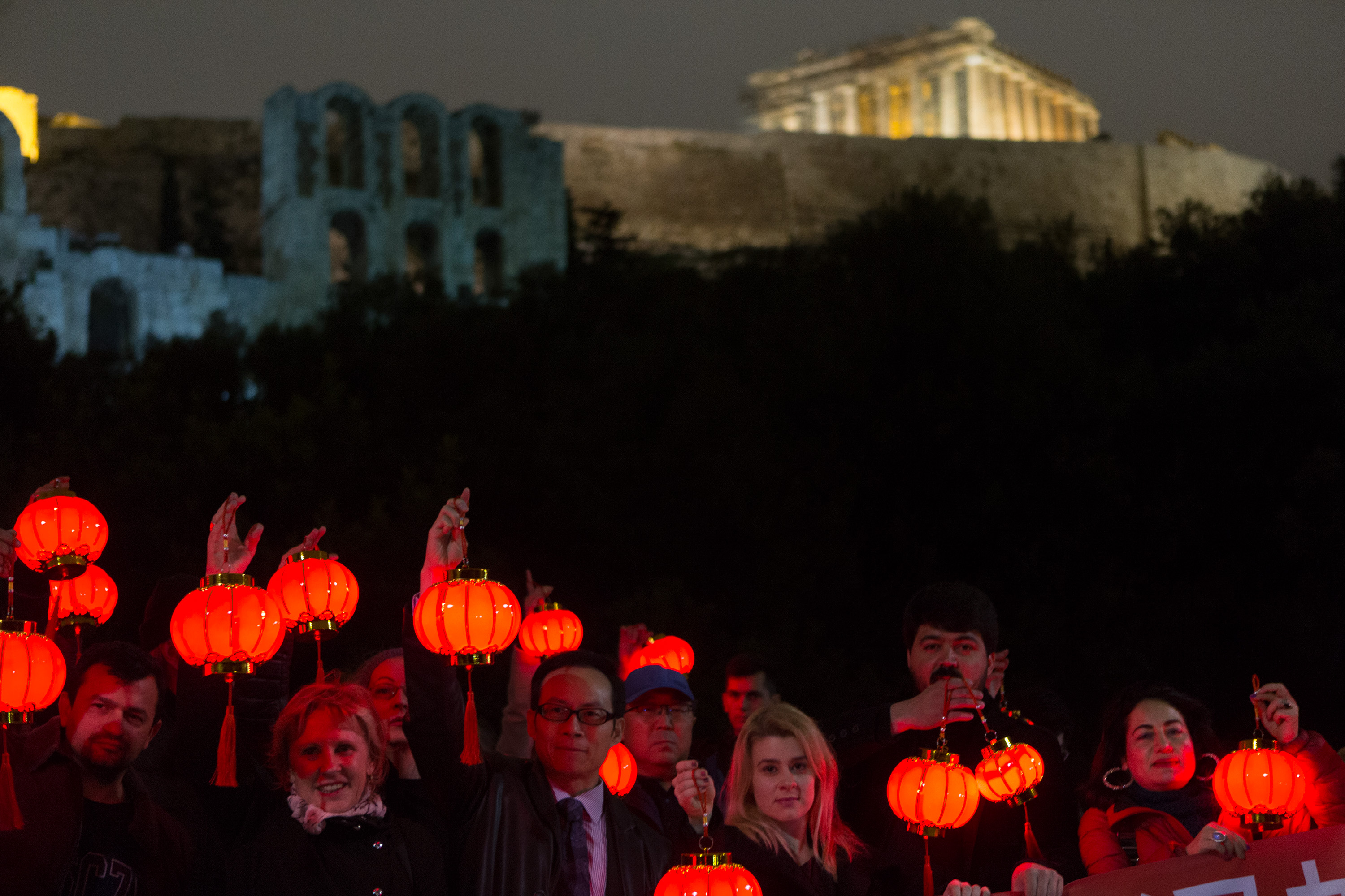Greeks and Chinese people living in Greece hold red lanterns at the foot of the Acropolis hill in Athens, Greece, Feb. 14, 2020. Under the auspices of the City of Athens, the Chamber of Greek-Chinese Economic Cooperation, along with business associations of the Chinese community in Athens and other groups representing citizens of Athens, organized the event to express solidarity with the Chinese people who are battling the novel coronavirus outbreak and stigmatization. (Xinhua/Marios Lolos)