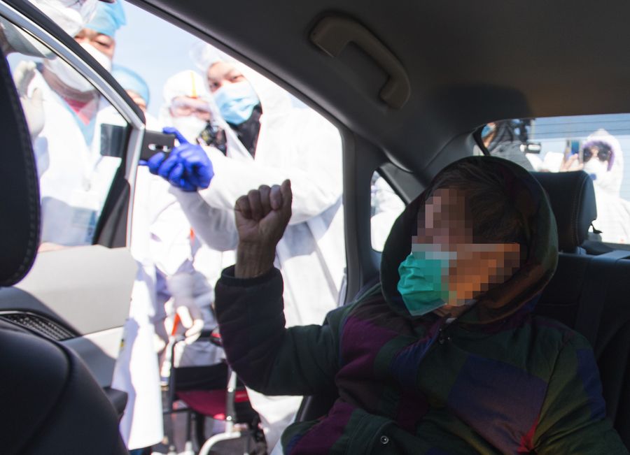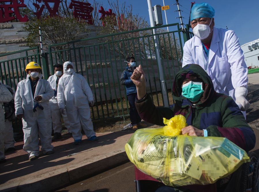 A 83-year-old cured patient waves goodbye to medical workers at the Leishenshan (Thunder God Mountain) Hospital in Wuhan, capital of central China's Hubei Province, Feb. 18, 2020.(Xinhua/Xiao Yijiu)