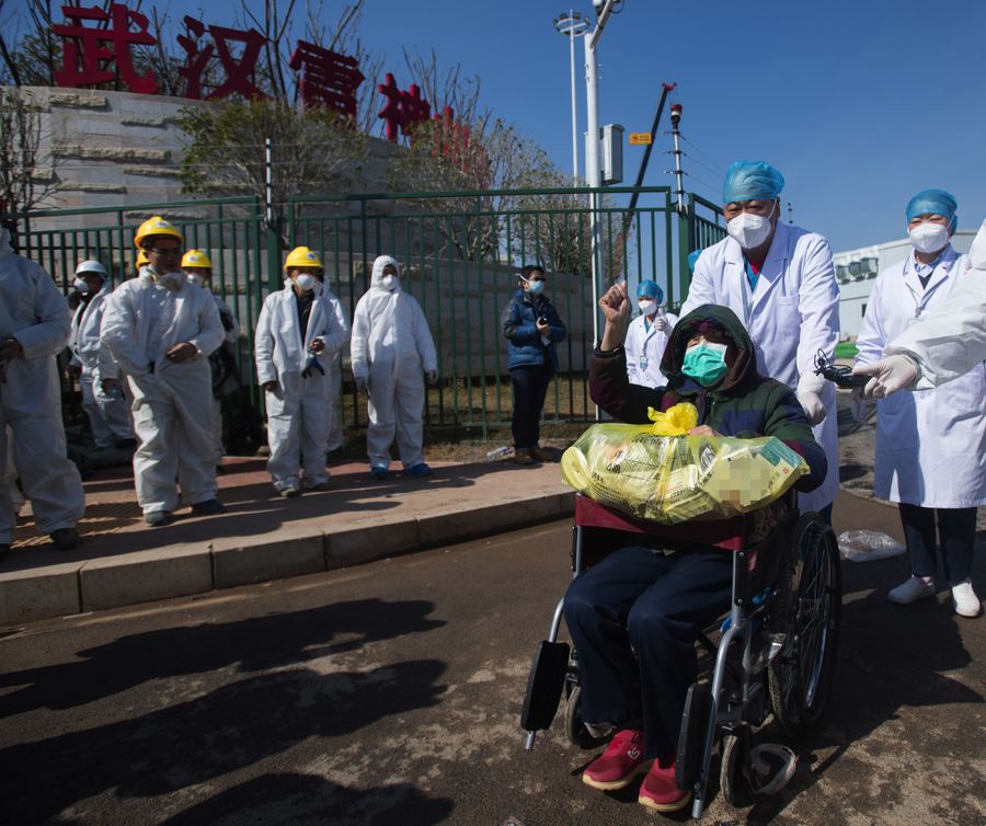 An 83-year-old cured patient waves goodbye to medical workers at the Leishenshan (Thunder God Mountain) Hospital in Wuhan, capital of central China's Hubei Province, Feb. 18, 2020. (Xinhua/Xiao Yijiu)