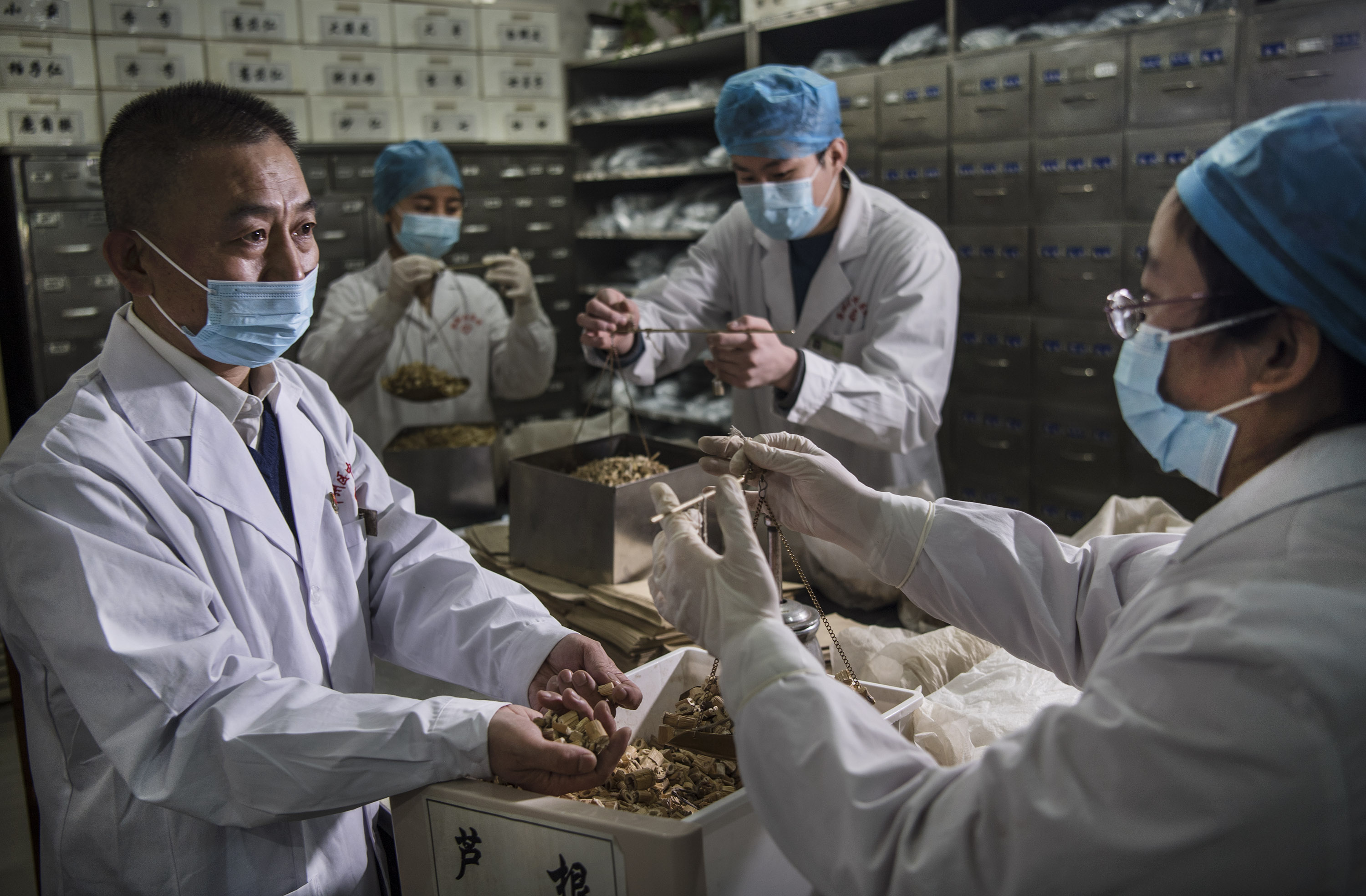 Medical staff work at a traditional Chinese medicine pharmacy in Weinan City, northwest China's Shaanxi Province, Feb. 20, 2020. (Xinhua/Tao Ming)