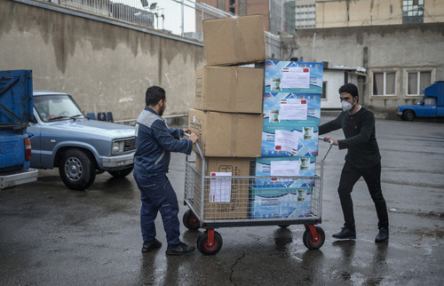 Staff of Iran's Ministry of Health and Medical Education arrange boxes of masks donated by China in Tehran, Iran, on Feb. 25, 2020. (Photo by Ahmad Halabisaz/Xinhua)