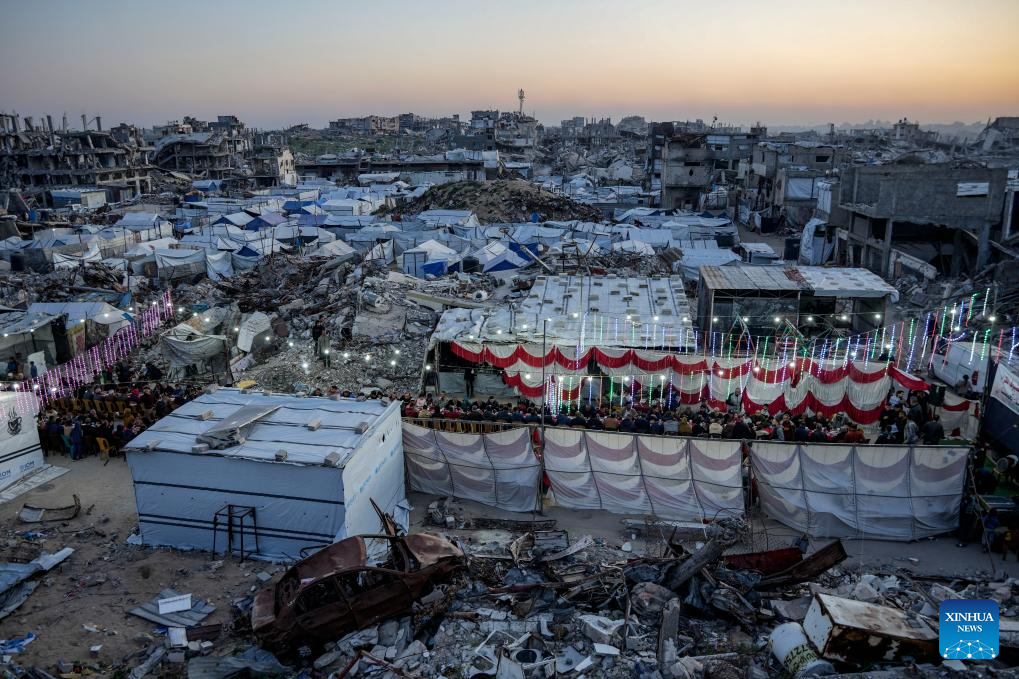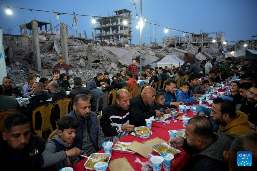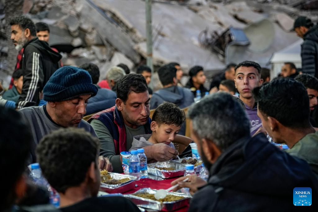 Palestinians participate in a group Iftar during the holy month of Ramadan in Jabalia, northern Gaza Strip, on March 17, 2026. (Photo by Rizek Abdeljawad/Xinhua)
