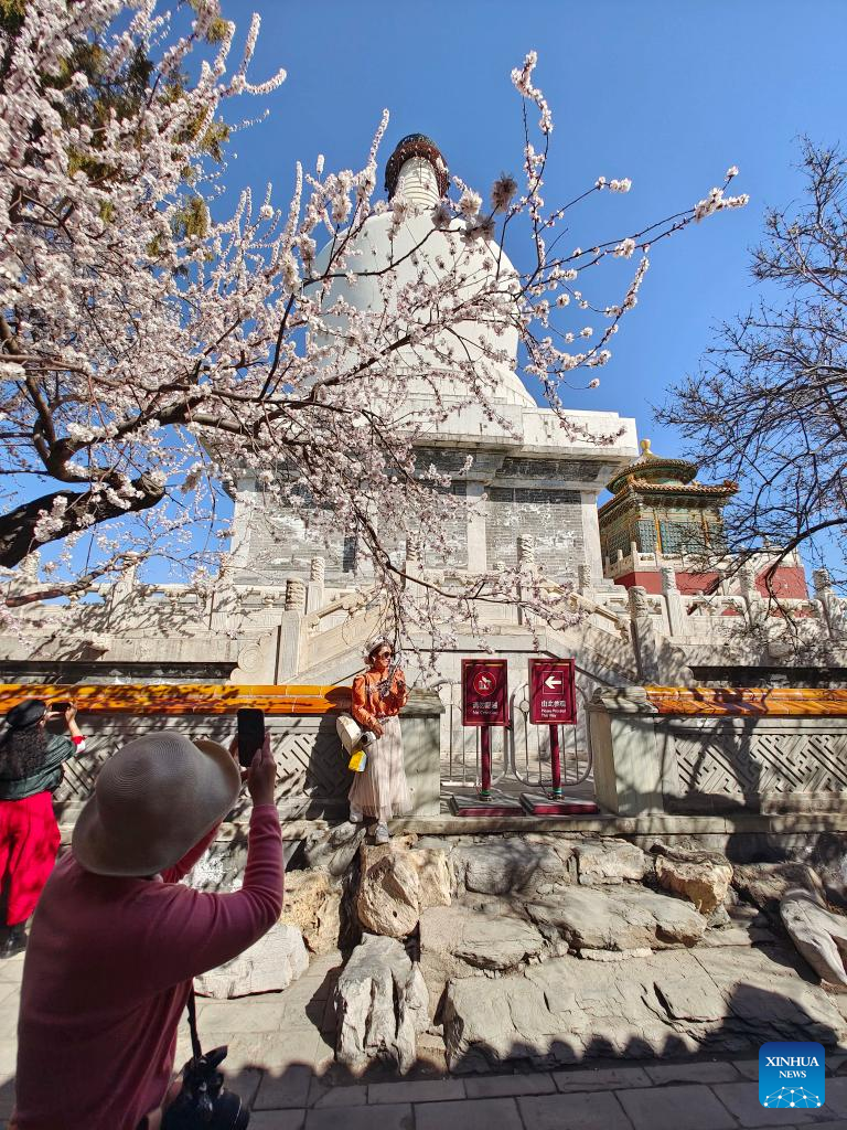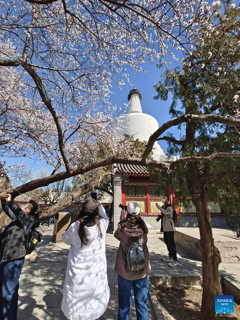 People take photos of blooming flowers at Beihai Park in Beijing, capital of China, March 14, 2022. (Xinhua/Xu Jinquan)