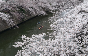 People enjoy view of cherry blossoms along Chidorigafuchi Moat in Tokyo