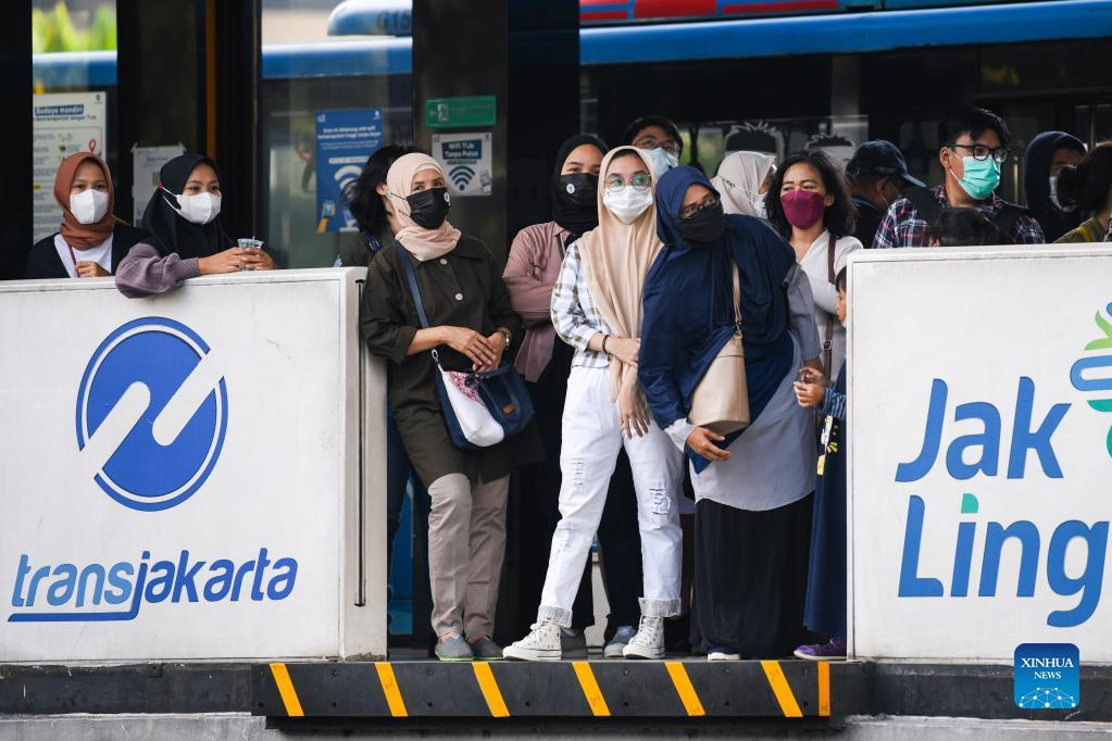 People wearing masks wait for buses at a bus stop in Jakarta, Indonesia, March 27, 2022. Indonesia has registered more than 6 million cases of COVID-19 since the first case was confirmed in the country in March 2020. On Monday, the Health Ministry reported that the coronavirus cases across the archipelago rose by 2,798 within the past 24 hours to 6,001,751 with the death toll adding by 104 to 154,774. (Xinhua/Xu Qin)