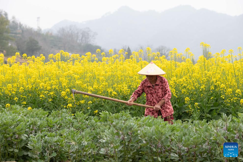 A villager works in a field in a village near the Xin'an River in Shexian County of Huangshan, east China's Anhui Province, March 16, 2026. As spring unfolds, rapeseed flowers along the Xin'an River, a bio-diverse waterway which flows from Anhui to Zhejiang, have entered blooming season. (Xinhua/Zhang Duan)
