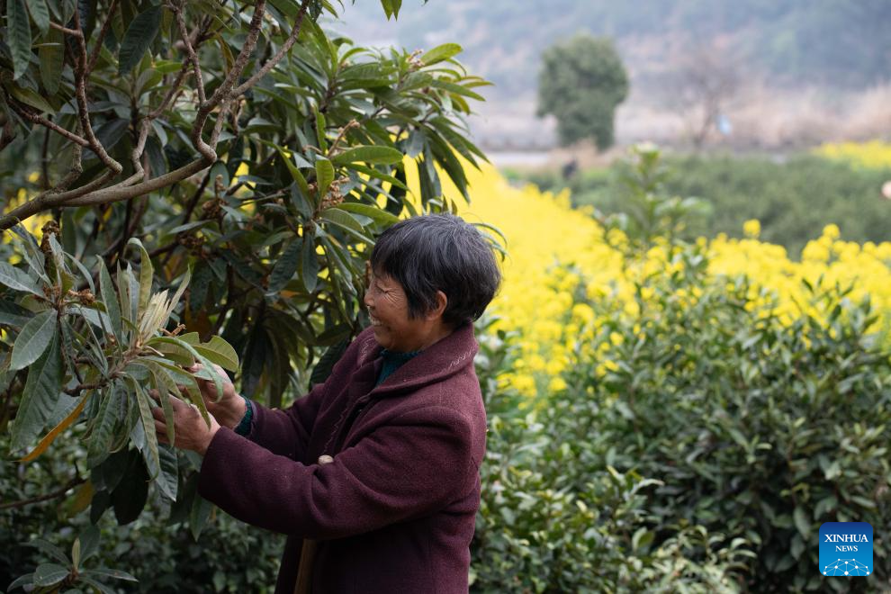 A villager tends a loquat tree near the Xin'an River in Kengkou Township of Shexian County in Huangshan, east China's Anhui Province, March 15, 2026. As spring unfolds, rapeseed flowers along the Xin'an River, a bio-diverse waterway which flows from Anhui to Zhejiang, have entered blooming season. (Xinhua/Zhang Duan)