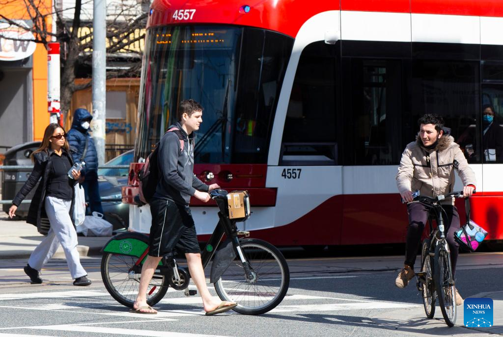 People cross a street in Toronto, Ontario, Canada, on March 21, 2022. Ontario's most long-standing measure of protection against COVID-19 lifted Monday, with masks no longer required to be worn in most indoor public areas, including schools, child-care and retail settings. (Photo by Zou Zheng/Xinhua)