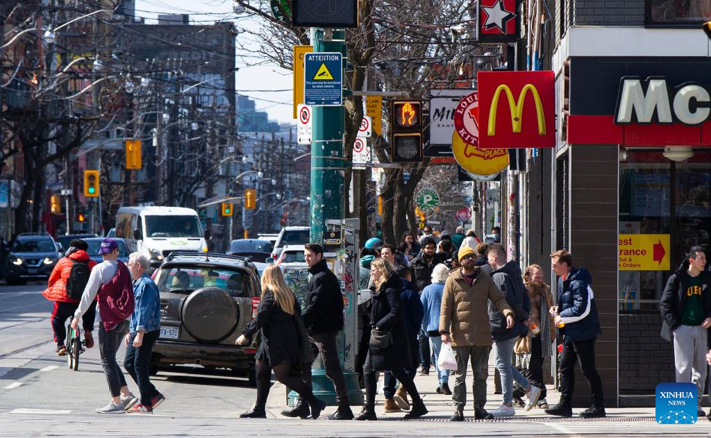 People walk on a street in Toronto, Ontario, Canada, on March 21, 2022. Ontario's most long-standing measure of protection against COVID-19 lifted Monday, with masks no longer required to be worn in most indoor public areas, including schools, child-care and retail settings. (Photo by Zou Zheng/Xinhua)