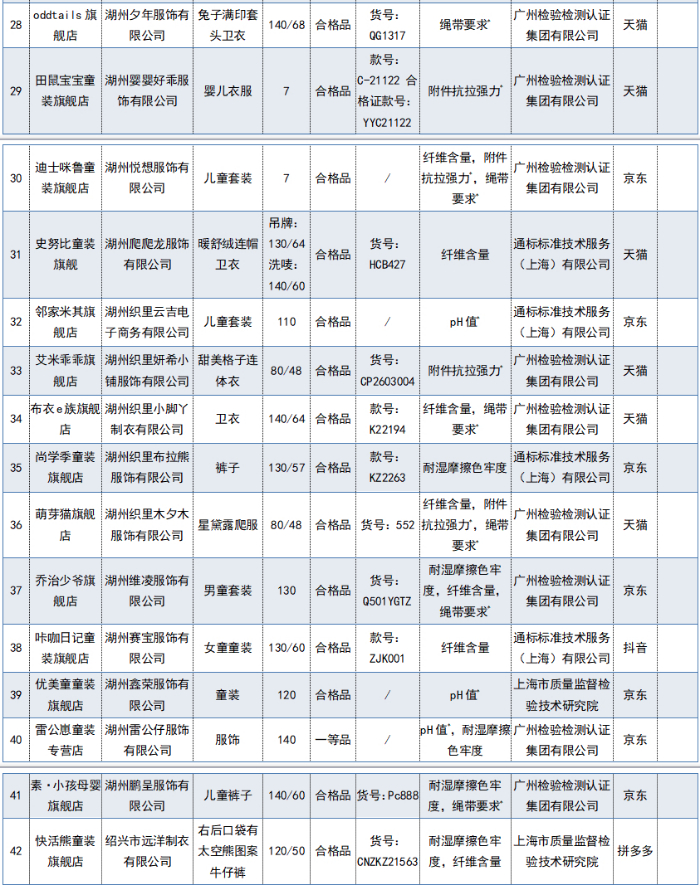 2022年网售儿童及婴幼儿服装质量国家监督抽查不合格产品及企业名单