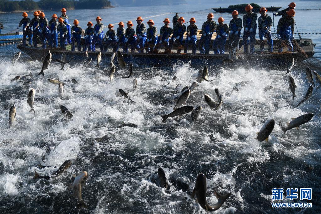 捕撈隊員在千島湖進行巨網捕魚(2018年11月28日攝)。近年來,千島湖以漁業為基礎,建立了集“養殖、管護、捕撈、銷售、加工、烹飪、旅游、文創”為一體的完整產業鏈,獲得經濟效益和生態效益的雙豐收。