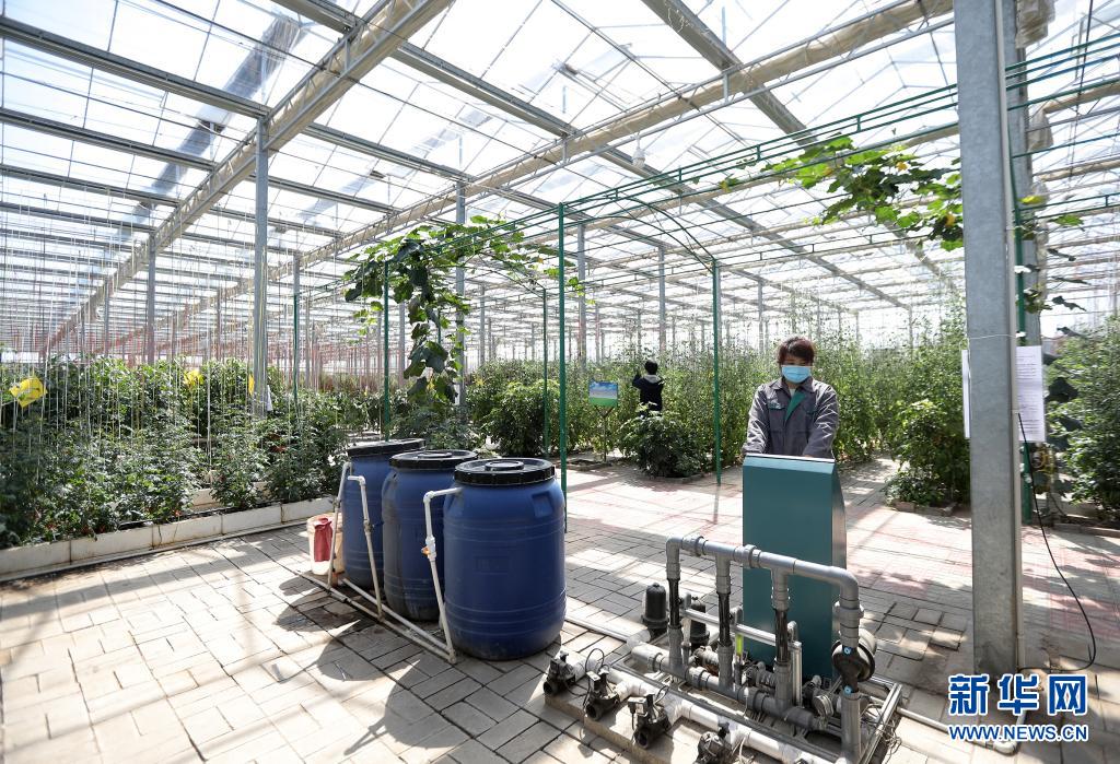 河北省饒陽縣一家現代農業示范園區工人在智慧溫室操作水肥一體化設施(2020年4月8日攝)。近年來,河北省饒陽縣在推進農業供給側結構性改革中,積極優化農業產業結構,依托現代農業示范園區建設,將自動滴灌、遠程數據采集、智能電力溫控等先進“工業化”技術應用于農業生產。