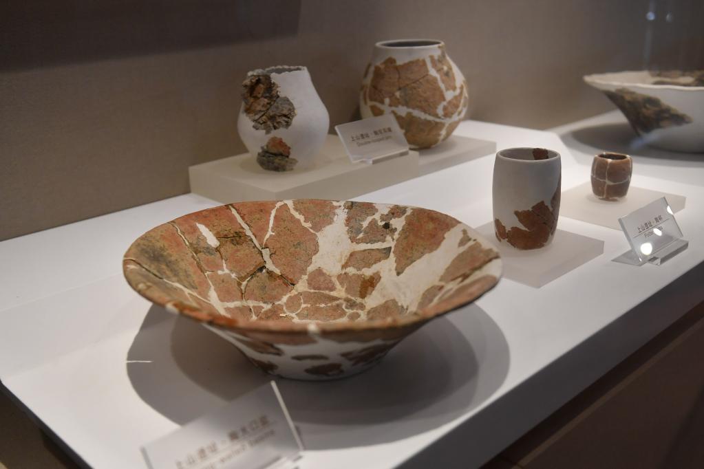 上山考古遺址公園遺址館展出的陶大口盆(5月12日攝)。新華社記者 黃宗治 攝