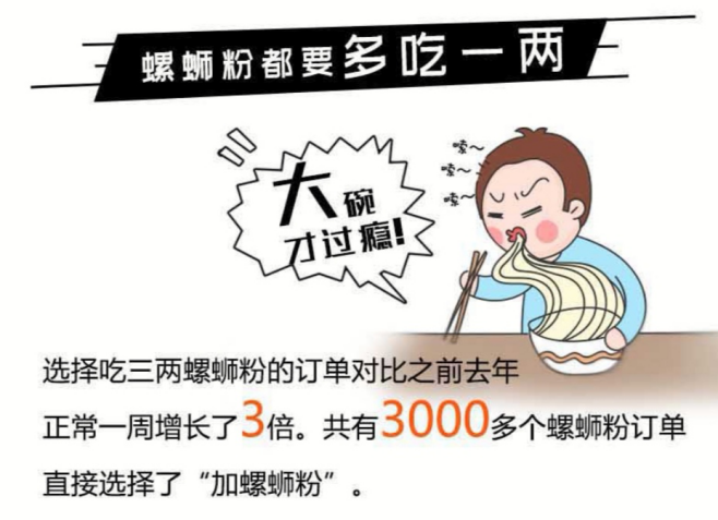 在南宁,螺狮粉好吃当然要多吃。当地消费者在复工后第一周到第四周的螺狮粉外卖订单量从1.4万份上升到近3万份,“全家福”套餐订单比对照周期内增长了4.2倍。同时,更多人选择多加一两粉,双管齐下满足自己的“大胃口”。另外,“鸭脚口味”螺蛳粉销量从以往的第21名升至第3位,忽然之间受到当地消费者青睐。