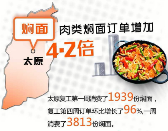 在太原,外卖焖面必选“豪华版”。据悉,太原消费者复工第一周消费了1939份焖面,第四周消费了3813份焖面,增幅较大。同时,吃货们更加追求焖面的丰富“内容”,与对照周期相比,既好吃又有营养的“豪华”套餐增长率为过去的2.3倍。