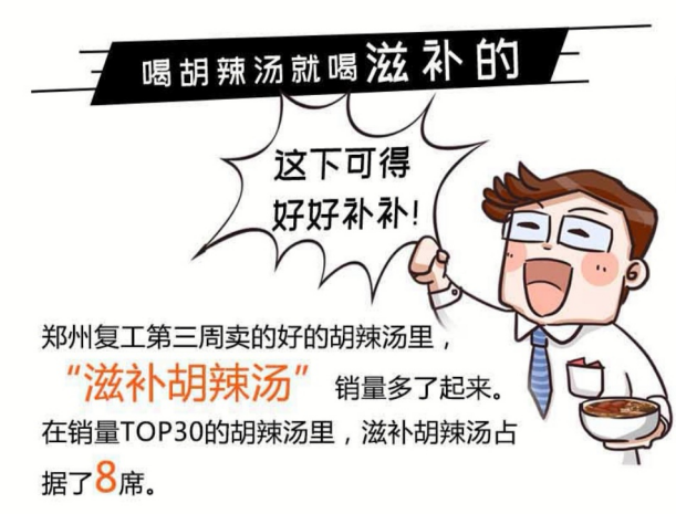 在郑州,“胡辣汤+2根老式大老油条”和滋补型胡辣汤套餐受热捧。当地消费者在复工第三周共消费9774碗胡辣汤,比第一周增长11.4倍。同时,“胡辣汤+2根老式大老油条”和滋补型胡辣汤套餐成为爆款,消费者追求好吃和营养的想法表露无疑。