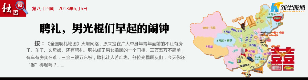 聘禮:敲醒青年男子們的警鐘 青年們,每天早晨叫醒你的不是鬧鐘,是娶妻聘禮!從五萬元淺水區到百萬元深水區不等, 各位騷年們,你們現在都在哪個區域裸泳?