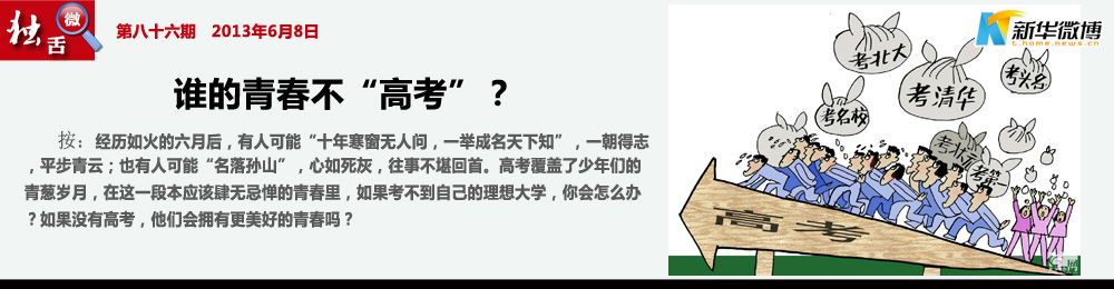 【為經(jīng)濟(jì)做貢獻(xiàn)】 算算高考,用了12年青春,至少四五十萬的學(xué)費(fèi),我們養(yǎng)活了晨光廠、真彩廠、機(jī)讀卡廠、無數(shù)造紙廠、無數(shù)印刷場,翰林書店、新華書店,城市的交通行業(yè),學(xué)校周邊的飯館,以及所有老師的工資獎金、校長的車、油錢……高考是國家支柱型民營企業(yè)!這就是我們的功勞!