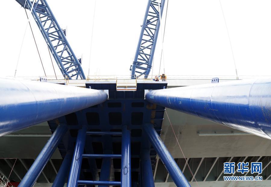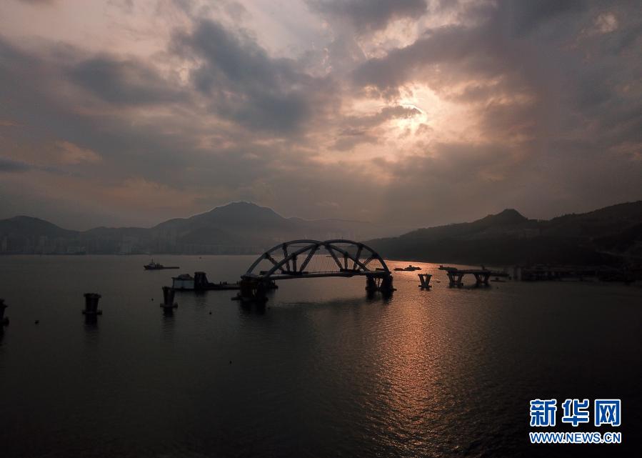 “冒出來(lái)”的并不是一座完整的大橋,而是一段跨徑長(zhǎng)達(dá)200米的雙拱鋼橋,在海面中央兀然矗立。“這是我們大橋工程最核心的主橋部分,技術(shù)難度最大,對(duì)整個(gè)項(xiàng)目有里程碑的意義。”承建單位中國(guó)路橋工程有限公司董事、項(xiàng)目總指揮闞軍說(shuō)。