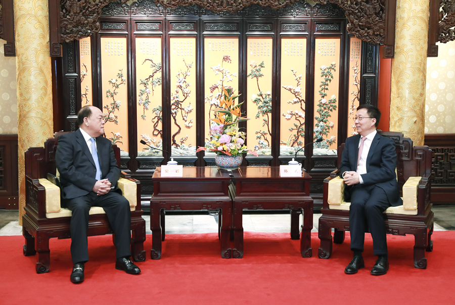 3月6日,中共中央政治局常委、國務(wù)院副總理韓正在北京釣魚臺國賓館會見澳門特別行政區(qū)行政長官賀一誠。新華社記者 龐興雷 攝