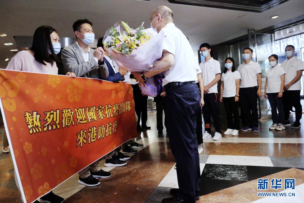 香港市民代表在香港九龍維景酒店歡迎內地核酸檢測支援隊抵港(2020年8月21日攝)。新華社記者 王申 攝