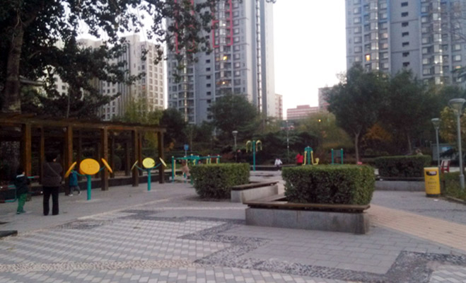 中心園林區呈現環狀結構,周邊依次排列著健身設施,遮陽長亭以及精神文明建設的標語。不少老年業主帶著孩子在此遛彎歇腳。