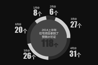 2014年上半年,共有118個住宅項目拿到了預售許可證。批準銷售總套數(shù)為38363套,已銷售套數(shù)為11146套。其整體月均去化率為13.64%。