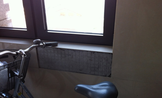 當記者與劉爺爺來到他居住的樓門前時,發現大門并沒有門禁,劉爺爺對記者說,看上去豪華的大門,其實一點都不實用。記者試了一下,發現確實很沉重,如果孩子自己開門,估計很難打開。劉爺爺說這個小區的實際質量和宣傳相差甚遠,樓內的瓷磚有掉落現象,安全梯鋪設的十分簡陋。劉爺爺讓記者從十五層向下俯視,小區所宣傳的法式園林只是一些楊樹和柳樹。庭院中間的小涼亭連休息的椅子都沒有,基本都是擺設。