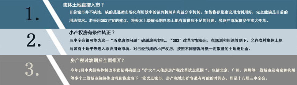 | 隨著十八屆三中全會的臨近,國務院發展研究中心專家的“383報告”引起熱議。 具體到房地產領域,“383方案”中共提到土地改革、小產權房、金融改革以及房產稅三個方面,與近期業內討論很多的房地產長效調控機制相關。 "土改"將成新的突破點,為樓市變革指明新的方向。 [詳細] |