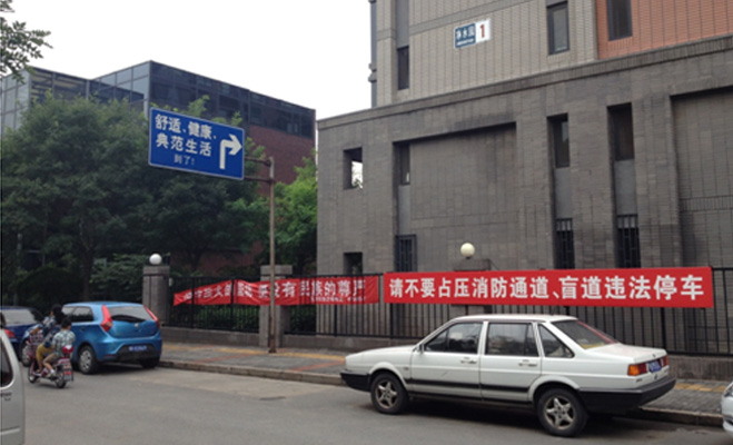 而對于購買了私家車的業(yè)主而言,每天進出小區(qū)也不太方便。記者注意到,盡管嚴禁占用消防通道的橫幅懸掛在凈水東路兩側,但是,這里依然幾乎停滿了私家車,還有幾輛為了節(jié)約空間,橫著停放在行人道上。