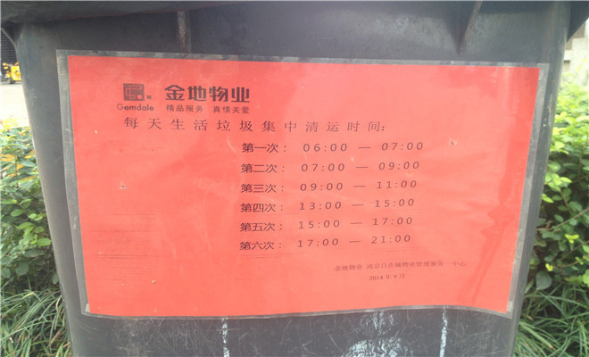 物業服務方面業主總體表示很滿意,其中一位陳姓業主告訴記者:“小區內定期會有專人進行綠化養護和衛生保潔,環境非常好。”同時,記者還發現基本上小區內垃圾桶上都貼有明確的每日清運時間,非常人性化。