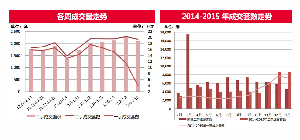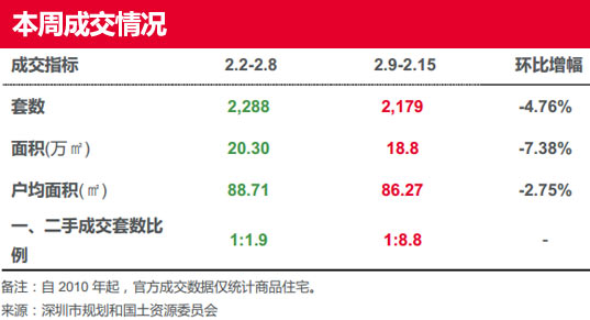 由于春節假期將至,并且本周(2.9-2.15)無新盤入市,深圳一手住宅成交套數及成交面積下跌均接近八成;成交均價下跌超一成。