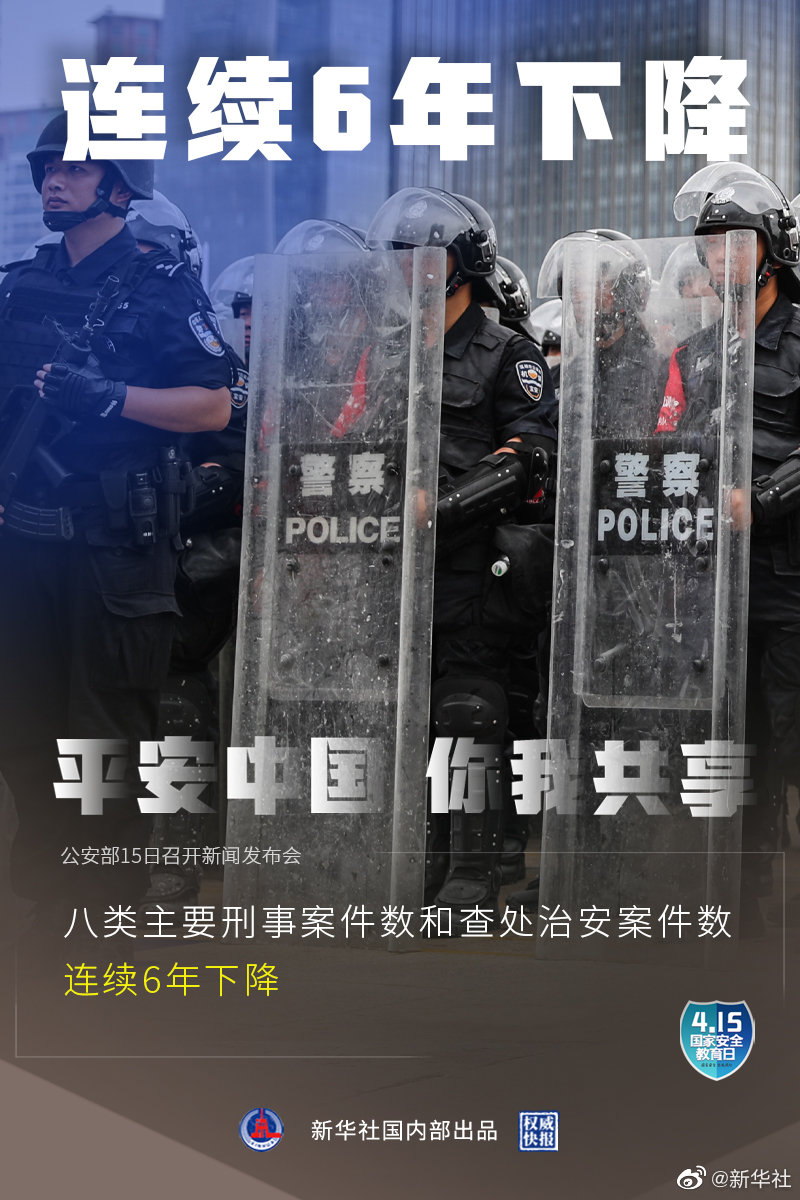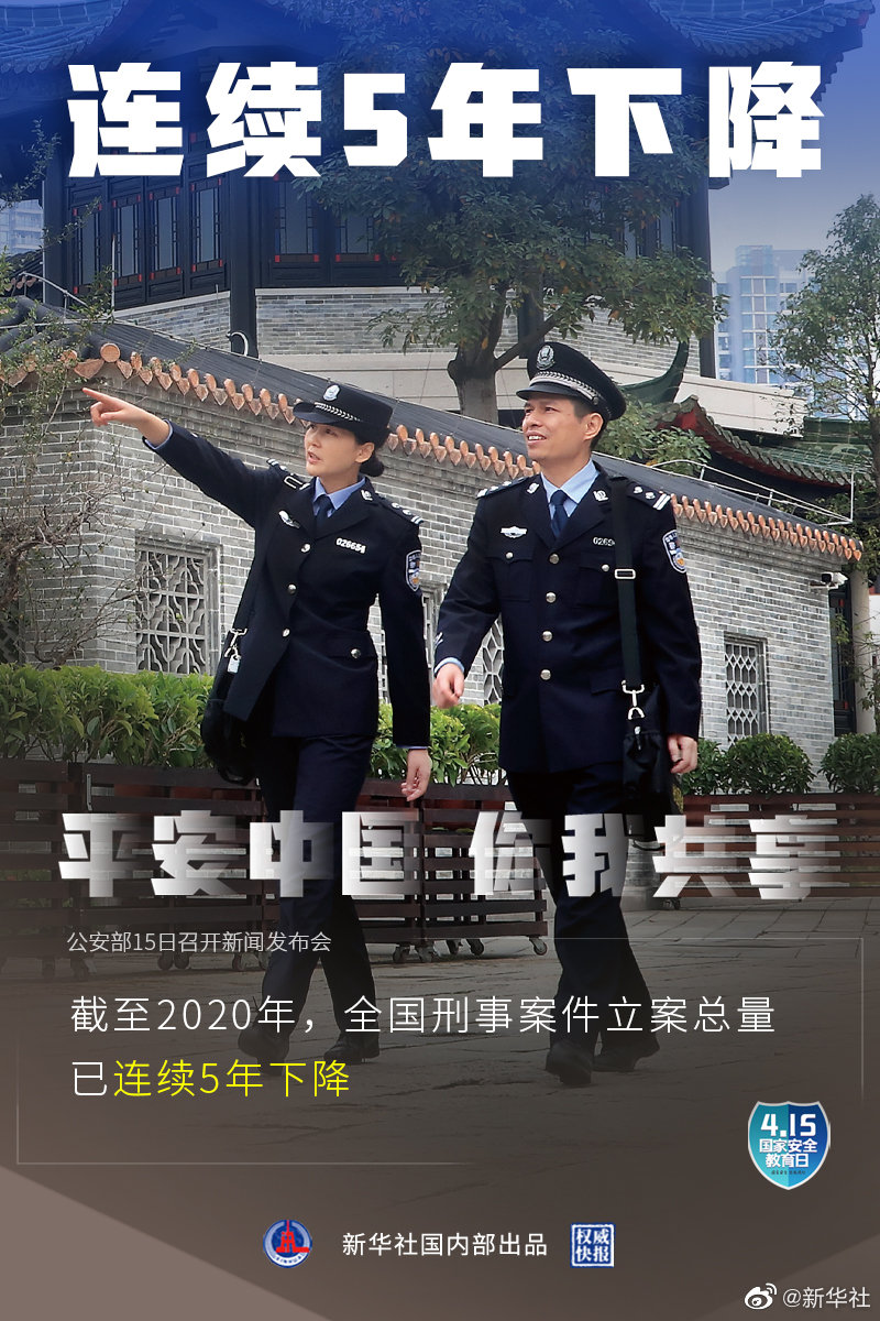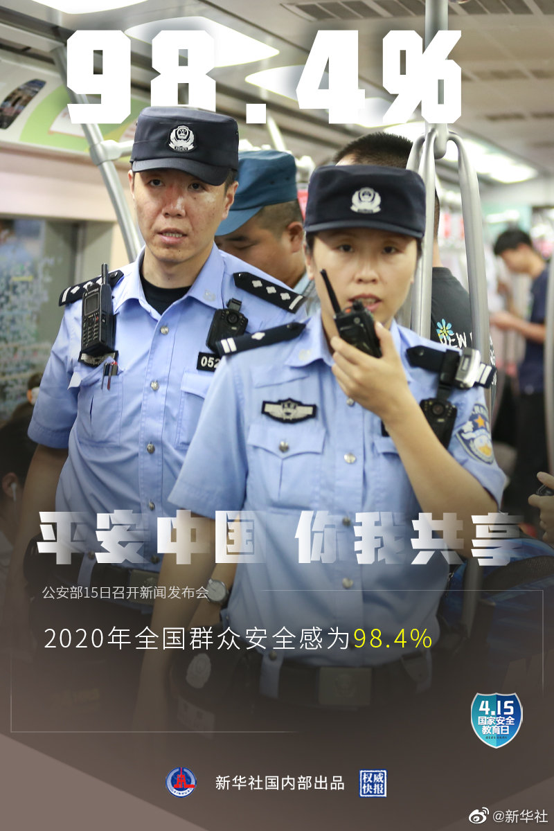 4月15日是第六個全民國家安全教育日,公安部15日召開新聞發布會介紹:2020年全國群眾安全感為98.4%,全國居民對社會治安滿意度達83.6%。截至2020年,全國刑事案件立案總量連續5年下降,八類主要刑事案件數和查處治安案件數連續6年下降。(記者熊豐,海報設計張晨光)