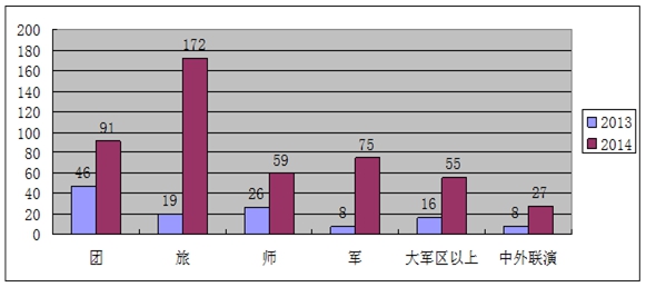 ??? ?There were 479 exercises held in 2014 above regiment level, many more than above division or brigade level, according to the Ministry of National Defense. By scale and significance in rising order, these exercises could be subdivided into six categories: battalion; regiment; brigade; division; corps; military region; and Sino-foreign exercises. In 2013, 123 exercises were held.