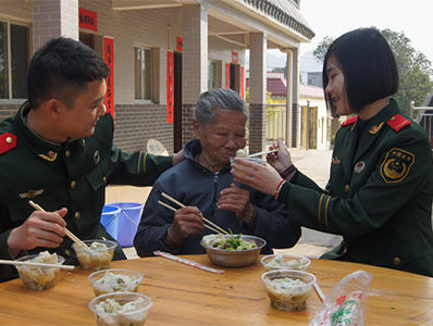 邊防官兵照顧老人吃飯
