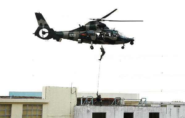 Two special operations soldiers fast-rope from a helicopter to attack the simulated enemy during the "Hong Kong Defender-2015D" joint exercise. The Chinese People's Liberation Army (PLA) Hong Kong Garrison carried out a "Hong Kong Defender-2015 D" joint exercise participated by the land, sea and air forces in late October.