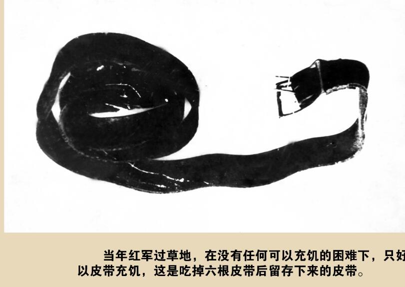 原來,這條皮帶是周廣才在1934年的一次戰斗中繳獲敵人的戰利品。但為了使全班戰友活下來,他只得含淚將皮帶拿出來。皮帶被切成幾段丟入滾燙的熱水中,煮熟后每人夾起“一截”狼吞虎咽的吃起來……當鍋里還剩最后“一截”時他哭著說:“同志們,咱們留著它作個紀念吧,帶到延安去見毛主席。”懷著對革命勝利的無限渴望,最終他們把這截皮帶留了下來。