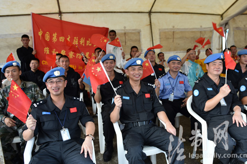 ????圖為蒙羅維亞時間10月24日,中國第四支駐利比里亞維和警察防暴隊徐曉偉政委(中)和隊員們一起為隊員們精彩表演加油 李金良攝