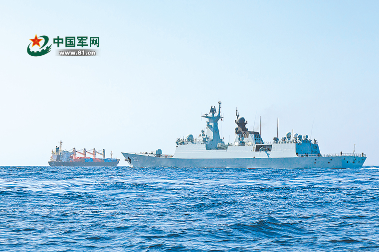 OS35號貨船在玉林艦的護送下向也門亞丁港附近海域航行。李維攝