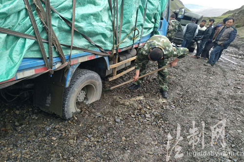 ????連日來,受強(qiáng)降雨天氣影響,通往西藏山南市錯(cuò)那縣卡達(dá)鄉(xiāng)道路因山體塌方和泥石流損毀嚴(yán)重,7月23日中午12時(shí),西藏邊防總隊(duì)山南邊防支隊(duì)卡達(dá)邊防派出所接轄區(qū)居民電話報(bào)警稱:商店運(yùn)貨貨車在返回卡達(dá)鄉(xiāng)途中陷入泥潭,請求派出所救援。接到消息后,該所迅速組織官兵趕往現(xiàn)場,并持續(xù)關(guān)注道路情況和受困狀況。到達(dá)現(xiàn)場后,邊防官兵立即展開救援,用十字鎬挖、用手刨、用人推,經(jīng)過2個(gè)小時(shí)的不懈努力,最終成功把陷入泥坑的貨車?yán)觥>仍Y(jié)束后,邊防官兵就近取材把泥坑填平,并設(shè)立警示標(biāo)志,確保后續(xù)車輛順利通過。現(xiàn)場無人員受傷,車輛完好。