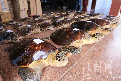 ????廣西邊防總隊(duì)防城港邊防支隊(duì)橫江邊境檢查站日前查獲疑似玳瑁標(biāo)本38只。7月25日,有關(guān)部門鑒定該批可疑標(biāo)本為國家二級(jí)保護(hù)動(dòng)物玳瑁,單個(gè)案值從2千元至3萬元不等。