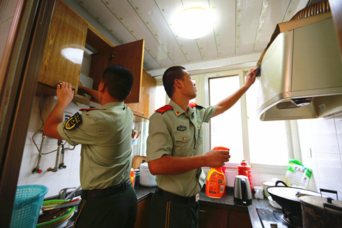 圖為江蘇鎮江邊防檢查站臨退老兵為老人擦拭廚房碗柜、油煙機