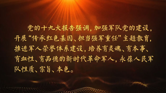 黨的十九大報告強調,加強軍隊黨的建設,開展“傳承紅色基因、擔當強軍重任”主題教育,推進軍人榮譽體系建設,培養有靈魂、有本事、有血性、有品德的新時代革命軍人,永葆人民軍隊性質、宗旨、本色。