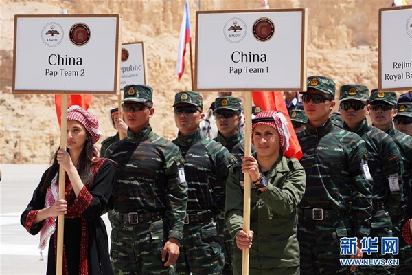 4月30日,在約旦阿卜杜拉國王特戰(zhàn)訓(xùn)練中心,中國武警代表隊隊員(后)參加“勇士競賽”國際特種兵比武。新華社記者 林曉蔚 攝