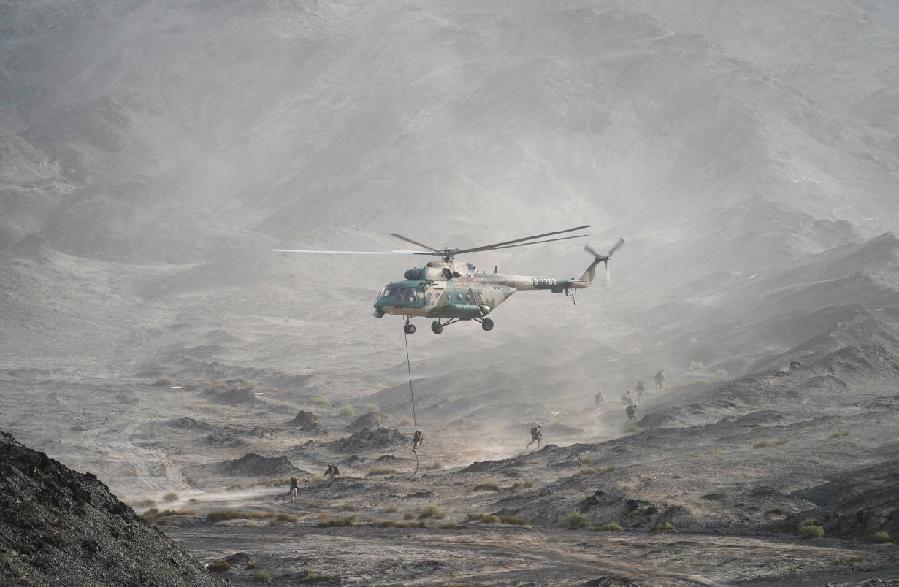 ????23日清晨,荒山丘陵遍布的庫爾勒訓(xùn)練基地,某特戰(zhàn)旅特戰(zhàn)分隊(duì)乘坐直升機(jī)迅速向“恐怖分子”的營地機(jī)動(dòng),演練的第一個(gè)課目就這樣毫無征兆地打響。