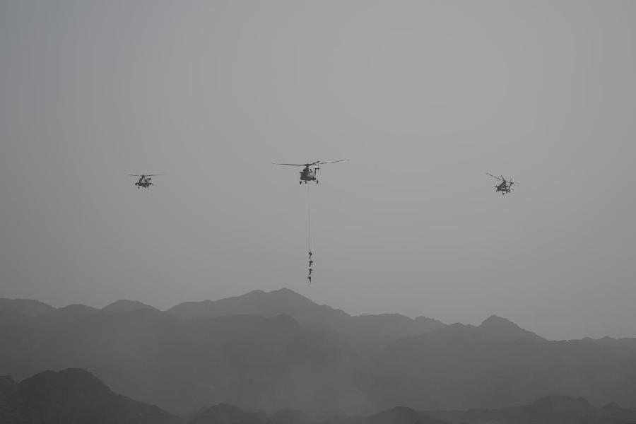????23日,陸軍新質(zhì)作戰(zhàn)力量演練在陸軍多個(gè)演兵場連續(xù)“打響”,8支新質(zhì)作戰(zhàn)力量輪番上陣。圖為特戰(zhàn)隊(duì)員進(jìn)行滑降。新華社記者王東明 攝