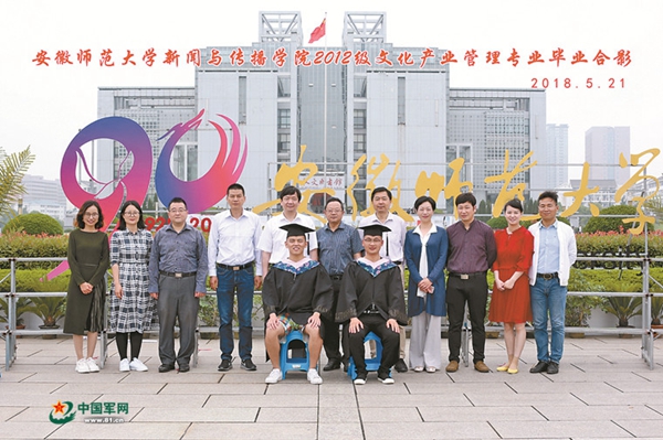 5月21日,安徽師范大學新聞與傳播學院組織應屆畢業生拍攝畢業照,眾多班級的學生依次排隊拍攝,其中一個班級與眾不同——只有兩名學生,而與他倆合影的卻有11名老師。并且,11名老師站在后排,兩名學生坐在前排。當相機的快門摁下之后,這張照片成為該校濃厚尊崇軍人氛圍的亮麗名片。