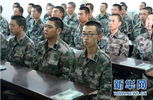 ????資料圖片: 2017年10月2日,在駐守在遼東半島的第79集團軍某旅新兵營,蔚晨陽(前右一)在認真聽課。新華社發(王立軍 攝)