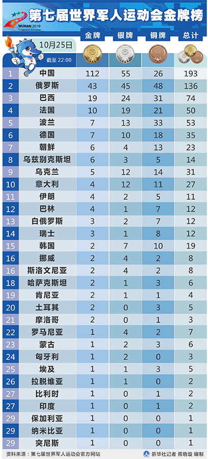 25日比賽結束后,中國軍團以112金55銀26銅繼續位居金牌榜和獎牌榜首位,俄羅斯隊以43金45銀48銅位居金牌榜和獎牌榜次席,巴西隊以19金24銀31銅位居金牌榜和獎牌榜第三。